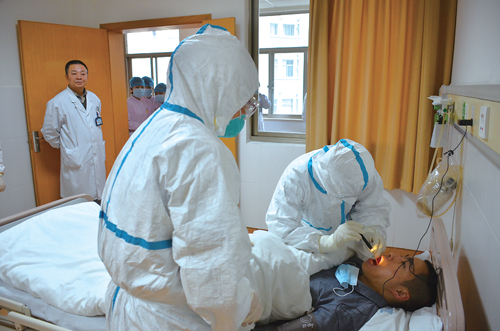 近期我市发现人感染H7N9禽流感病例,我院高度重视,积极开展全员培训,组织开展应急处置演练;加强疫情监测,开展流感样病例监测、传染病症状监测和不明原因肺炎监测;完善各项应急预案、规范应急处理流程;做好药品、消毒、防控物资的储备。图为2月3日人感染H7N9禽流感防控实战演练现场。