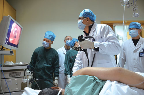 ▲温医一院消化科副主任吴伟开展胃镜下胃底静脉曲张套扎联合组织胶栓塞术