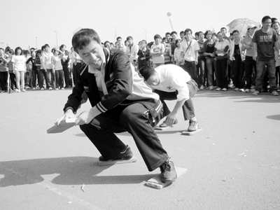 经历了“摸石头过河”的齐心协力奋斗,师生们又进入了“无灯驾驶”比赛。只见一名选手被蒙上双眼,由后面的一位选手用双手搭前者肩,给前者动力一起绕S桩前进至桩尾,再调头继续绕桩返回起点。08计算机2班的韦兴中是被“驾驶”的同学,他一边拆下蒙住眼睛的布条,一边说“很刺激,很兴奋”,成教学院会计1班的于静则说:“我真的好害怕!怕踩到桩子,没有了安全感!”