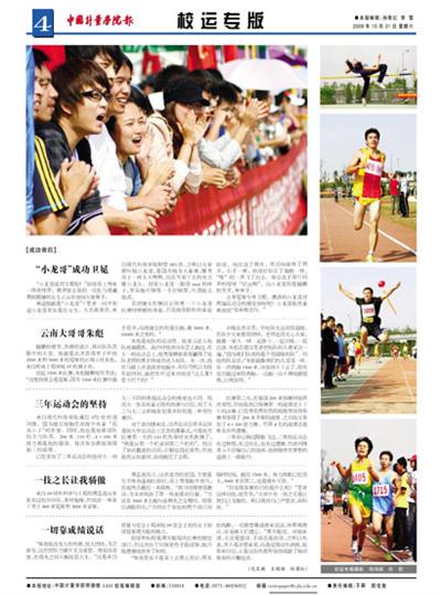 “体育能改变人的性格,使人团结,为之奋发,这在团队力量中尤为重要。我看淡荣誉,在得失之间不断收获人生。”这是来自质量与安全工程学院09安全2班的女子铅球冠军周天聪的格言。