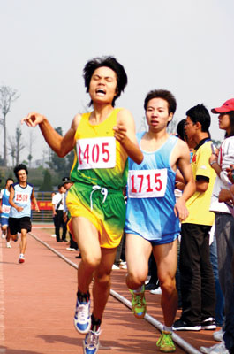来自09材料科学与工程的周孟波从未参加过校田径队,身材偏瘦,但他却一举拿下男子800米冠军和3000米亚军。