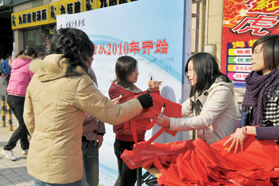 本报讯 来超市购物的市民只需在活动的主题喷绘板上写下新年里对环境,对地球的祝福,便可领取一只红色的环保袋。日前,中国计量学院布艺协会的同学们在下沙物美超市门口发放自制的环保袋,向广大市民倡导“新低碳生活从2010年开始”。