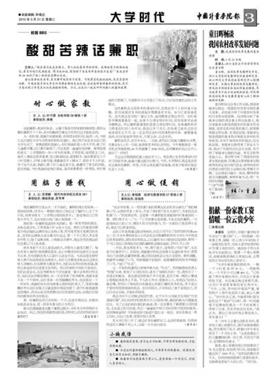 说起兼职,我深有体会。从餐厅服务员到家教到做销售,我所从事的兼职不下十种,其中的酸甜苦辣也只有经历过才能体会到。