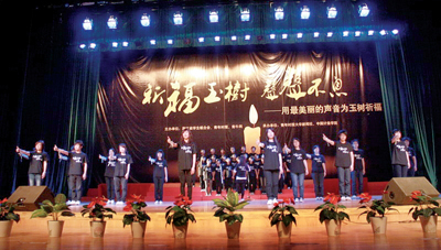 “从地震发生到今天已经12天了,在这12天里面,我们的师生一直没有停止努力。”这段时间,校团委书记刘秀丽一直关注和支持着同学们用自己的方式为玉树灾区同胞送去关心和祝福的各种行动。“我们的志愿志在第一时间发起了募捐活动,他们赶制宣传单,捧着捐款箱走上老师的班车,通过书信的方式为灾区的小朋友送上鼓励。”活动当晚,刘秀丽和青年时报社副总编范波共同为各高校十佳歌手代表领唱,为大家带来了一首感人至深的《生死不离》。