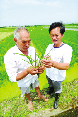 国家科技支撑计划项目——区域农业生态系统害虫生物防治关键技术与示范余姚基地由我校生命科学学院和省农科院植微所、余姚市农科所、河姆渡镇农办共同建设,基地内推广的多种杀虫微生物制剂、稻田生态养殖控害技术、物理诱杀技术等,能有效减少投入和污染、促进农业可持续发展。图为农技人员正在基地察看水稻长势情况。
