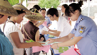 7月8日,凤凰县中心文化广场增添了一条亮丽的风景线。在“绿色质量万里行”公益宣传活动现场,我校实践队员与凤凰县质监局的工作人员一起,向当地群众和游客发放了质量安全公益宣传手册、质量安全法律法规等相关资料,赠送了由国家质检总局制作并下发的公平交易保护器,并现场为群众提供质量安全问题咨询。