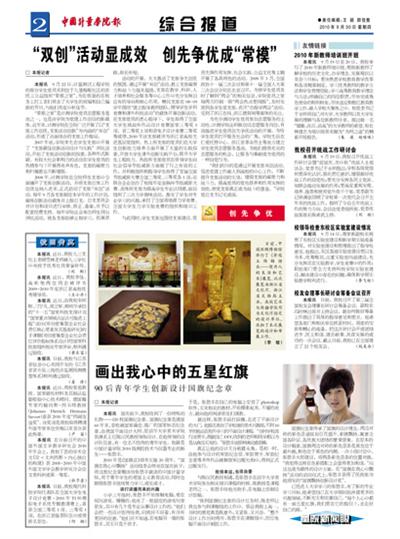 本报讯 国庆前夕,我校收到了一份特殊的礼物——120枚国旗纪念章。国旗纪念章是建国60年来,首枚被国家确定、推广的国家标志纪念章,由我国平面设计大师、原清华大学美术学院装潢系主任陈汉民教授领衔设计。在他带领的设计队伍里,有一位名不经传的青年学生。他就是中国计量学院2010级测控技术与仪器专业的新生——张碧丰。