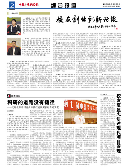 宝剑锋从磨砺出。凭借着作为第一作者发表的多篇SCI、EI收录论文和专利等创新成果,周文俊荣获了2010年度中国仪器仪表学会特等奖学金,成为全国两名特等奖获奖者之一。2011年,他又摘得了第七届“中国青少年科技创新奖”,是浙江省的五位获奖学生之一。