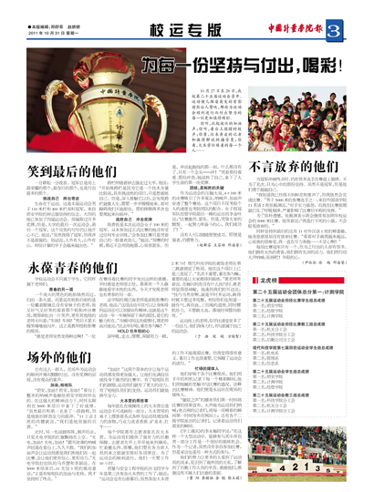陈青钦是本次运动会女子100米的冠军。从未参加过正式比赛的她没有受过任何专业训练,“会参加比赛只是凭着自己的一股喜欢劲儿。”她说,“预赛的时候,都还不会用助跑器,心里很紧张。但是,冲出起跑线的那一刻,什么都没有了,只有一个念头——冲!”凭着那份喜爱、那份冲劲,她战胜了自己,拿下了大学生涯的第一块奖牌。