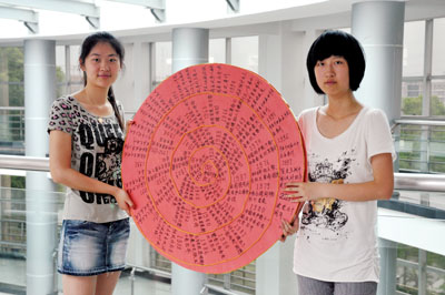 日前,以“非创意,不生活”为主题的艺术与传播学院第六届广告文化艺术节闭幕。本届广告文化艺术节,围绕“建党90周年”的主题,开展了学生书画作品展、广告策划大赛、海报设计造型大赛、纸艺大比拼等活动,用艺术的方式表达了青年学子对党的生日的美好祝福。图为纸艺大赛中名为“年轮”的作品,记录了中国共产党建党90年来的坚实足迹。(本报记者/文  宁明渊/摄)