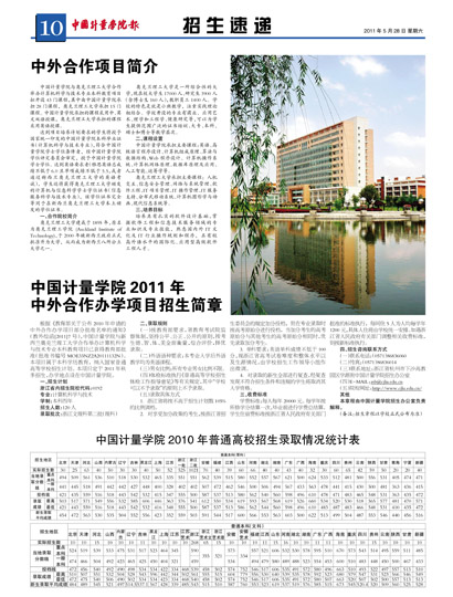 | 中国计量学院2010年在浙江省录取情况统计表 | 中国计量学院2011年中外合作办学项目招生简章 |