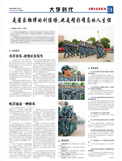 回顾自己几年的从军生涯,周教官颇有感触。他说,自己在刚入伍的时候,作为一名新兵参加部队的训练,教官对自己的要求也是非常严格,甚至可以用“苛刻”来形容。可是,现在回想起来,就会觉得,真的很感谢那段苦过来的日子。“虽然现在有一些同学还不能够理解,为什么在训练场上我要对他们要求这么严格,但是在大家军训结束后,在今后走向社会,遇到困难与挫折后,再回顾这段军训岁月,相信如果大家还能想起我这位严厉的教官,更多的可能会觉得庆幸与感谢。” 在军训中,周教官用他的方式给参训的同学上了一堂关于人生与吃苦的哲学课,让大家去领悟“吃苦也是一种资本”。