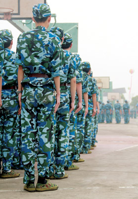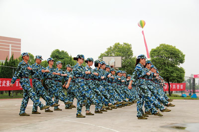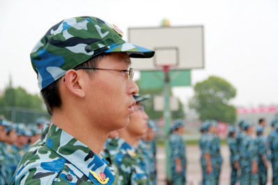 定位然后矫正,每一个动作的变化都要经过不断地调整与练习。站军姿、走正步、摆臂等动作要做到精益求精,力求完美:站军姿双脚要挺直,双手自然下垂紧贴;走正步要腿打直,只听得到一个声音;摆臂要整齐,高度要一致……面对周教官的“高标准、严要求”,自然有不少同学因为动作不达标而遭遇“狮吼”般的训斥,而那些在训练中注意力不集中或者偷懒、开小差的同学,当然也逃不过周教官的“火眼金睛”,常常连累整个队伍一起受罚。