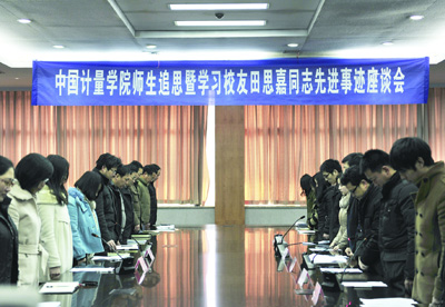 座谈会上,原任田思嘉同志大学期间辅导员的李峤老师回顾了田思嘉同志在校时的优秀表现。“给我印象最深的一件事情是田思嘉在大学最后一个学期主动请缨担任班长。当时正值金融风暴,学院就业压力很大,他不计个人得失,不厌其烦地为班级同学搜集、转发就业信息,帮助贯彻学校就业政策,积极引导同学就业,用实际行动诠释了什么是‘责任’。”李峤说:“田思嘉虽然已经离我们远去,但他为这个社会、为母校、为学弟学妹们留下了一笔宝贵的精神财富。他身上体现出的临危不惧、奋不顾身、不怕牺牲的英雄气概和乐于奉献、甘于献身的高尚情操是我校多年来加强和改进大学生思想政治教育工作所结出的硕果,是一本价值不菲的生动教材,值得我们每一个人去认真研习!”
