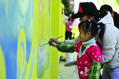 3月25日,我校艺术设计专业的学生在杭州市下城区康乃馨儿童康复中心进行卡通墙绘,为自闭症儿童送去关爱。详见本期3版。(宁明渊/摄)