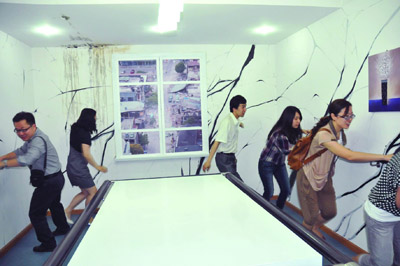 为了增强我校师生在地震、火灾等突发性灾害事故中的逃生、自救和互救技能,作为2012年“全国防灾减灾日”的主题活动之一和“辅导员职业技能培训”第三讲,5月10日,党委学工部、保卫部、体军部、团委联合在我校“自护自救模拟训练实验室”开展了“防灾减灾”模拟演练,我校全体辅导员、近百名班级安全委员参加了演练。图为师生们在地震逃生模拟实验平台进行体验。(王小丹/文 王 玮/摄)