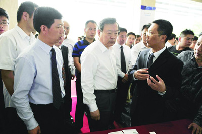 在我校的科研成果展位前,夏宝龙省长视察了“化学危险品试验仪”、“食品安全免疫快速检测技术及产品”、“DSIS-W700高清网络播放机”、“新型磁性材料”等成果实物,对我校科研成果转化给予了充分肯定。