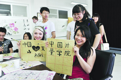 学书法、练汉语、吃小吃……近日,加拿大里贾纳大学的25位师生来到中国计量学院与中国文化来了一次“亲密”接触。据悉,这是两校的一项汉语言文化交流项目。图为加拿大里贾纳大学的学生在展示她们的书法练习成果。(陶 凯/文 宁明渊/摄)