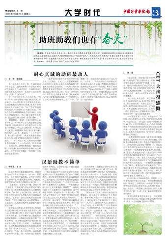 编者按:新学期已经过去月余,大一各班的助班们都在正常开展工作,CET4英语助教招募已全线打响,汉语助教招聘会也在紧锣密鼓地进行中,助班助教们迎来了他们的“春天”。你想成为助班助教吗?你想切实提升自己发现和解决问题的能力吗?你想拥有一段不一样的大学经历吗?那就把握学校提供的机会,带上你的胆大心细,装上你的专业能力,来试试吧!或许属于你的“春天”,就在不远处等你。