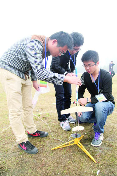 11月3日早晨7点的操场,雾霾还未散去,微雨迷蒙,一架架火箭助推滑翔机已经划破了操场上静谧的天空。在我校承办的浙江省第二届大学生力学竞赛上,92架滑翔机进行了一场飞行较量。