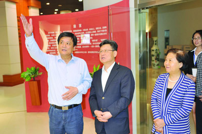 5月16日,联合国原副秘书长、著名外交家沙祖康大使应邀做客我校嘉量讲坛。图为报告会开始之前,党委书记胡建成陪同沙祖康大使及夫人参观学校计量史馆和校史馆。(王  玮/摄)