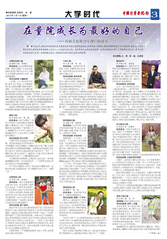 前 言:2013年,学校首次面向毕业生开展量院吉尼斯之星的评选活动。这项活动一经推出,便在校园里引发了不小的反响。随着2013年首届吉尼斯之星评选结果的揭晓,9位个人、3个寝室首度上榜。他们有着什么样的成长故事?大学生活给他们留下了哪些难忘的记忆?有什么好的经验与他人分享?本期校报让我们一起探访首届吉尼斯之星背后的故事。
