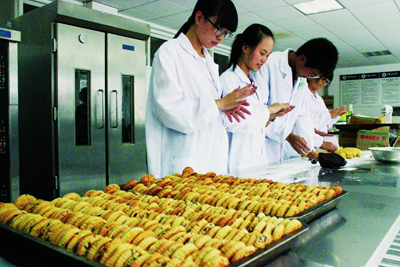 采购原材料、研究配料比例、和面、生坯成型、烘烤、包装,今年中秋,我校生命科学学院的实验室里临时组建起了一条月饼“生产线”。食品质量与安全专业的30多位大学生学以致用,花了两天时间,制作了3000多个月饼送给师生。他们说:“自己做的月饼地道、美味且有食品安全保证。”(石景成/文 潘淑雯/摄)
