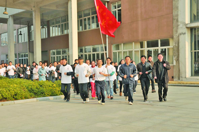 以音乐和歌声送别旧年,以环校跑迎接新年,这是我校近年来的传统。1月2日,胡建成、林建忠、徐涌金、宋明顺、王小华、吕进等学校领导和我校1500余名师生一起用“环校跑”这一特殊方式迎接2014年的到来。(本报记者/文 王 玮/摄)