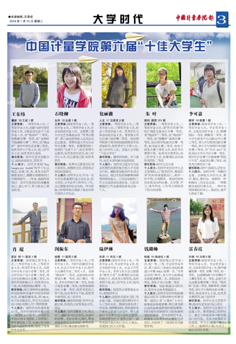 个人简介:该同学在担任校跆拳道运动队队长期间曾组织策划第一届浙江省“计量杯”大学生跆拳道品势邀请赛,现已成为浙江高校跆拳道联盟的常规赛事。同时他时刻保持学习的热情和刻苦的精神,多次获得奖学金,积极参与各类学科竞赛和科研项目,并获得了一项授权实用新型专利。