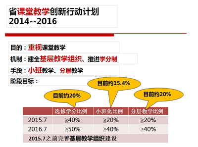 目前,学校已经采用教改立项、短学期制、新生研讨课等各种方式推进小班化教学。2013至2014年,学校30人以下的教学班有654个,学校力争到2015年7月,小班化教学所占比例不低于20%。