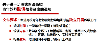 青年教师刚从学生角色转换,在教学上有诸多不适应。自2009年开始,学校实施青年教师开课资格认定制度,要求承担本科教学任务的高校教龄不足2年的教师均须进行开课资格的认定,严把新教师开课关。