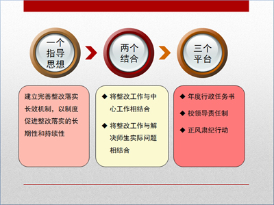 在贯彻教育实践活动整改落实工作中,学校党委确立了“一个指导思想、两个结合、三个平台”的工作思路。一个指导思想是“建立完善整改落实长效机制,以制度促进整改落实的长期性和持续性”;两个结合即“将整改工作与中心工作相结合,将整改工作与解决师生实际问题相结合”;三个平台即“年度行政任务书、校领导责任制、正风肃纪行动”。通过“两个结合”来抓整改工作的实效,通过“三个平台”来抓整改工作的落实。