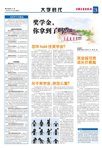 其实,像郭宇轩这样“被”通知拿奖学金的同学并不少。虽然很多人对奖学金抱着无所谓的态度,但奖学金评定过程中的学生参与度和评比透明度仍然是大家关心的。郭宇轩就认为优秀学生单项奖学金的评选应该提高学生参与度,“因为评定依据是难以量化的,而且有些是学校不了解的,比如某学生课外积极社会实践的经历很难拿出证明,但周围的同学会看在眼里,就可以推举其获得相应的奖学金。”