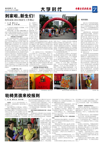 他的“特殊”要从小时候说起。张雪松小时候就得了脊髓海绵状血管瘤,从11岁起开始半身瘫痪,胸部以下的身体部位没有知觉。虽然生活不便,但八年来,在轮椅上生活与学习的张雪松却一直“正能量”满满,他是2005年度感动台州十大人物,被评为浙江省优秀少先队员,拿过四星雏鹰奖章……今年高考,他以优异的成绩被我校计算机科学与技术中外合作专业录取,坐着轮椅走进了大学校门。