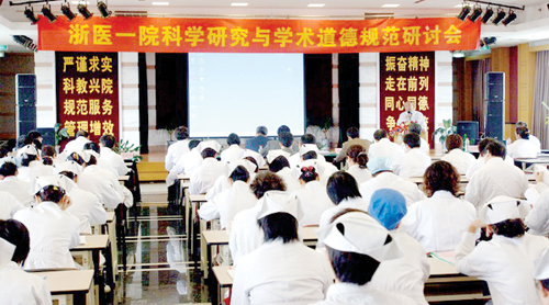 接着,厉有名副院长作了《加强学术道德和学风建设,提高学术论文质量》的报告,他简要回顾了我院近几年来科研工作取得的成绩,通报了医院发表SCI论文总体情况和排名前十位科室,希望今后进一步发挥重点实验室和研究生的力量,在SCI论文数不断增加的同时,进一步提升论文质量和影响因子,争取发表高水平的论文。他还介绍了日前修订完善的“浙医一院科学研究和学术道德规范”、“关于规范外投稿件中浙医一院相关信息的规定”、“科研项目管理规范”等,再次强调科学研究以创新为灵魂,以质量为生命,要求大家在学术道德规范方面“勿以善小而不为,勿以恶小而为之”。