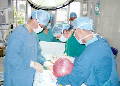 医生们为阿柔行卵巢囊肿摘除术的场面,图中球状物即为从腹腔中取出的囊肿。