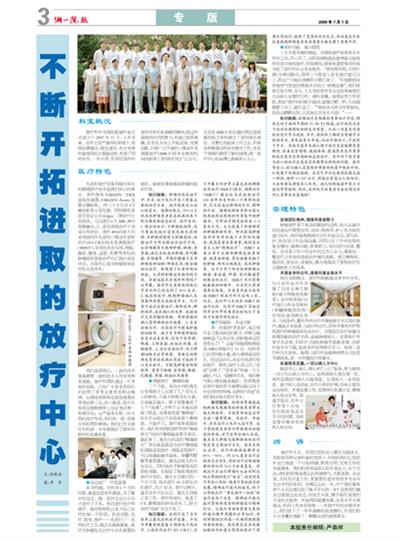 放疗科作为我院新建科室正式成立于2007年11月。1年多来,在科主任严森祥的带领下,坚持品牌建设,特色建设,充分发挥科室成员的主观能动性,形成了团结协作、一丝不苟、任劳任怨的科室作风和无私奉献的精神,经过科室成员的共同努力,科室已初具规模,在专业方向上开拓进取、发展创新,目前广泛开展的三维适形及调强放疗(IMRT)技术在极短时间内获得了省内同行的广泛认可,无论在IMRT的实施比例还是质量控制方面均确立了省内领先地位。在繁忙的临床工作之余,科室亦积极推动科研及教学工作,在各个领域均取得了新的成绩,浙一放疗中心的品牌已渐渐深入人心。