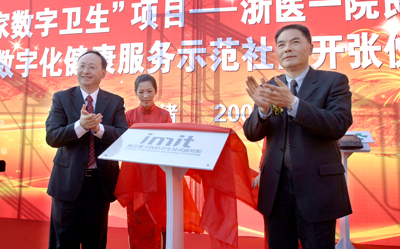 本报讯 2009年12月5日下午,阳光灿烂、晴空万里,在余杭良渚文化村随园嘉树,举行了浙江数字医疗卫生技术研究院揭牌仪式暨“国家数字卫生”项目——浙医一院良渚文化村数字化健康服务示范社区开张仪式。出席仪式的领导和专家有卫生部副部长尹力,浙江省副省长金德水,浙江省人民政府副秘书长马林云,科技部高新司司长冯纪春,中国卫生信息协会会长、中国工程院王陇德院士,中国卫生信息学会副会长傅征,卫生部统计信息中心主任饶克勤,卫生部医院管理研究所所长梁铭会,浙江省卫生厅厅长杨敬,浙江省科技厅厅长蒋泰维,浙江省科协党组书记鲁增善。参加仪式的还有:原中国工程院副院长侯云德院士,中国工程院医药卫生学部主任、浙江数字医疗技术研究院院长杨胜利院士,中国卫生信息学会副会长、浙江数字医疗卫生技术研究院常务副院长李兰娟院士,以及中国工程院赵铠院士,王威琪院士,陈赛娟院士,侯惠民院士,刘昌孝院士,我院院长郑树森院士。此外,浙江大学副校长吴朝晖,中华医学会副秘书长杨民,中国卫生信息学会副会长李包罗、金水高、马斌荣,中国医院协会信息管理专业委员会副主任委员何雨生,浙江省卫生厅副厅长张平、马伟杭,纪检组长蔡新光及各处室负责人,浙医一院党委书记薛金增及其他班子成员,浙医二院院长王建安,余杭区卫生局局长黄国林,浙江万科总经理周俊庭和资深副总裁陈军和来自美国Marshfield Clinic CEO 奥立克博士,香港卫生署助理署长邝国威,澳门卫生局副局长陈惟蒨等也参加了开张仪式。(下转4版)