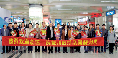 “你们辛苦了,赴青川对口支援医疗队的英雄们!你们展现了医务工作者的风范,每一个浙一人为你们感到骄傲!”2010年3月26日下午2点40时许,我院第八批赴青川对口支援医疗队成员们搭乘的班机顺利飞抵杭州萧山机场,胜利凯旋。我院党委书记薛金增、院长助理沈晔率院办、党办、医务科、工会等相关部门负责人专程前往机杨迎接载誉归来的医疗队员。薛书记代表医院党政领导向每位队员献上一束鲜花,对队员们不辱使命,力克万难,勇敢地战斗在工作及生活条件艰苦的抗震救灾最前线,为对口支援青川地震灾区的医疗救治和灾后重建而无私奉献的精神,表示感谢并致以亲切慰问。