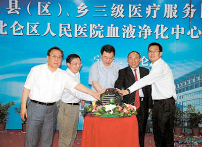 2010年5月22日下午,“省、县(区)、乡三级医疗服务网络暨北仑区人民医院血液净化中心开业典礼”在浙医一院北仑分院隆重举行。卫生部医管司司长张宗久,卫生部医管司高光明处长,中国医院协会秘书长李月东,浙江省卫生厅副厅长马伟杭,浙江省医院协会会长、原省卫生厅副厅长杨泉森,浙江大学医学部党委书记陈智,中国工程院院士、浙医一院院长郑树森,浙医一院党委副书记陈江华,宁波市卫生局有关负责人,区委副书记陈国军,区人大常委会副主任顾惠良,区政协副主席袁侠,宁波市台商协会会长宣永康等出席庆典活动。活动由副区长丁素贞主持。