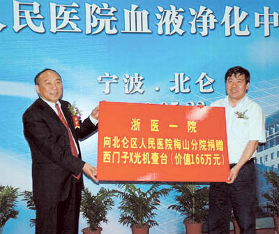浙医一院向北仑分院梅山分院捐赠价值166万元的西门子300毫安X光机一台。据悉,为了满足北仑及周边各种急、慢性肾功能衰竭(尿毒症)患者的血液透析治疗及中毒病人的抢救等医疗需求,北仑分院新建了国内一流的血液净化中心,由浙医一院肾脏病中心副主任医师何强担任中心主任,设有3个血液净化治疗区,配置全新二级发渗水处理系统,拥有日本进口TORAY血液透析机、血滤机20台,每周可提供血液透析服务240人次。