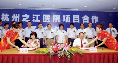 2010年7月8日上午9:30,《杭州之江医院合作意向书》签约仪式在玫瑰园度假酒店隆重举行。市人大常委会副主任、西湖区委书记、之江度假区党工委书记郑荣胜,西湖区委副书记、区长、之江度假区党工委副书记、管委会主任王立华,西湖区人大常委会主任吴国良,西湖区政协主席张岐等西湖区领导和我院院长郑树森院士,党委书记薛金增,副院长顾国煜,党委副书记厉有名、陈江华,院长助理王伟林、沈晔,西湖区相关部门和我院相关职能科室负责人,一同出席项目意向书签约仪式。签约仪式由西湖区委常委、副区长、之江度假区党工委副书记、管委会副主任王炬主持。