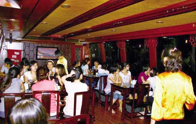 初至码头,“泛舟天堂水,相约古运河”在霓虹灯的照射下格外醒目。夜色中黛色的河水清阴而寂静,偶尔涟漪微皱。水声漾起时,船已稳稳地出驶。看那河边婀娜的柳枝,显现出淡淡的墨痕,清晰而玲珑。如此巧妙的勾勒,又有着另一种奇妙的韵味。