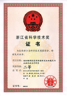 证实CD3AK细胞对耐药白血病细胞株有杀伤作用,为临床应用提供了实验基础。对白血病细胞B7分子表达调控及基因转染的研究居国内先进水平,为临床应用基因转染治疗白血病及其他恶性肿瘤提供了实验基础,有较好的临床应用前景。研究了白血病细胞起源的树突状细胞的体外培养和功能。为开展以树突状细胞为基础的肿瘤免疫治疗打下了基础,获得浙江省科学技术奖二等奖。