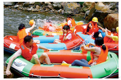整个漂流的全程共有3处大落差,每到一个大落差前,必有一个水流平坦之处,而这平坦,却决不平静!正当我们被大自然的绝妙景色所陶醉时,总有一阵阵的“黑雨”从天而降,我们毫无防备,惨遭他人偷袭,无奈地只有讨饶,然后默默地用头盔将皮艇里的水舀出……