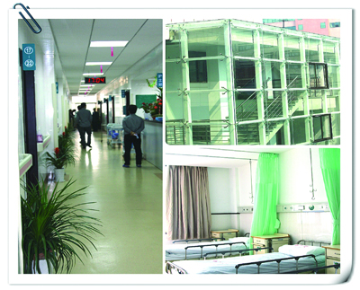 经修缮,7号楼外楼道安装全封闭玻璃幕墙,并且将原来的铝合金窗户全部进行了更换,使得7号楼更加安全、时尚、美观。此外,对2到4楼每个楼层的转角处的空间充分利用,专设了医疗废物存放点。在各病区,走廊的瓷砖贴到顶,病区内贴瓷砖1.5米高。为了方便医疗,2到4楼的三层病区全部安装中央吸引和集中供氧。为确保病人的安全,在病区走廊和卫生间均安装了紧急呼叫按钮。而各病房内新增加的粉绿色窗帘不仅更好的保护病人的隐私,也使病房更加温馨。