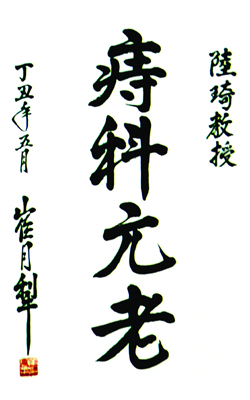 1997年,我国卫生部老部长崔月犁为陆琦教授题词:“痔科元老”。