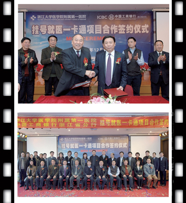 (上接1版)签约仪式首先播放了《精湛合作 共赢发展》挂号就医一卡通项目宣传短片,详细介绍了“一卡通”项目的合作内容及未来发展方向,将开展“多渠道本异地挂号”、“先诊疗后付费”等新型业务,为病人就医提供方便、快捷、优质的服务。多渠道就医挂号是指就医群众在医院原有提供的现场挂号、网络预约、电话预约的基础上,增加工商银行的自助服务机、网上银行、手机银行、电话银行等渠道的自助挂号;医院则为通过银行服务渠道自助申请挂号的就医群众提供本异地实名制挂号服务。“先诊疗、后结算”的便民服务是指就医群众通过每次就诊检查时的资金预冻结方式,免除就医群众多次付费的排队手续,有效地缩短患者挂号、等候、取药的时间。挂号就医一卡通支持实名制就诊、随诊支付等新型就诊模式,可减少排队次数,简化就诊流程,实行“一站式”看病,将有效地优化服务流程。这样方便的看病模式明年一季度有望实现,只要手持一卡通,就可在浙医一院体验轻松、便捷的就诊服务,无需在各个收费窗口重复排队,极大地方便患者,提高医院的工作效率。