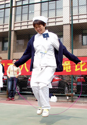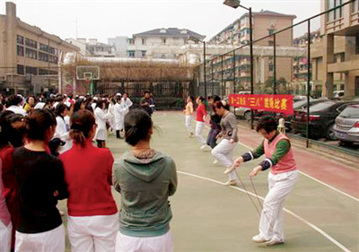 为迎接“三八”国际妇女节,丰富我院广大女职工的业余文体生活,2011年3月4日和3月8日中午,院工会在篮球场分别举行了女子单人跳绳团体赛和趣味投篮团体赛活动,来自我院各个科室逾520位女职工参加了此次趣味比赛。