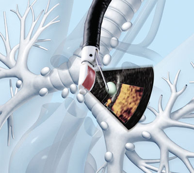传统支气管针活检存在技术难度大、正确诊断率低、对患者刺激大等问题。超声支气管镜即在气管镜前安装超声探头,可以在超声波图像上确认淋巴节的位置及把握血流状态,犹如给气管镜装了一双“火眼金睛”,让经支气管壁穿刺活检不在盲目,穿刺几乎“百发百中”。是一种安全性高、诊断率高、重复性强,手术创伤非常小的气管镜活检新技术。